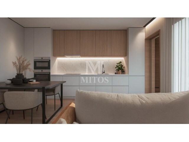 Caixilharia com vidro duplo e estores elétricos, pré-instalação de ar condicionado, cozinha equipada com eletrodomésticos moderno.
