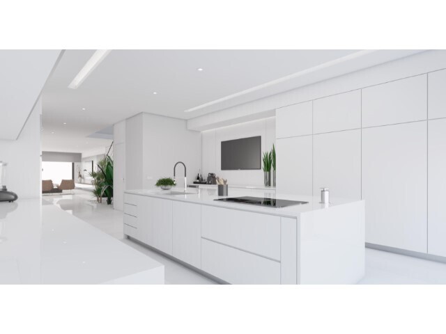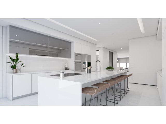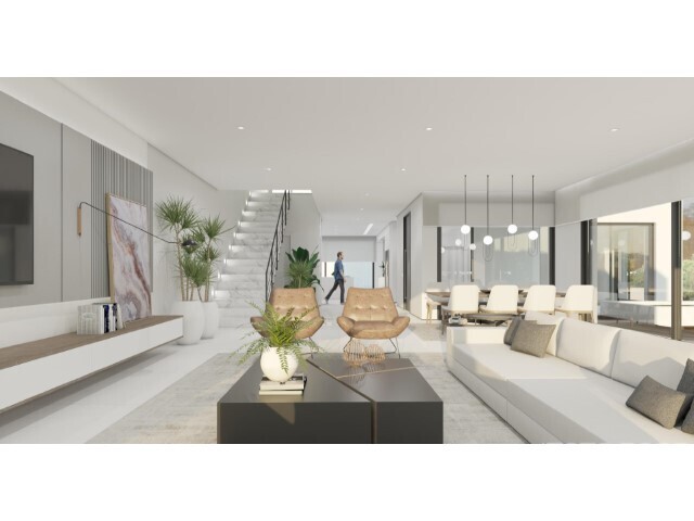 O projeto prevê uma moradia unifamiliar moderna, distribuída por três pisos, com jardim, piscina privativa e vista desafogada de mar: