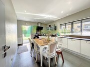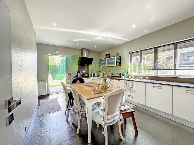 A moradia é composta no rés do chão por hall de entrada, uma grande cozinha com despensa, uma fantástica sala com zona de jantar e de estar com lareira, uma casa de banho de serviço, um escritório e uma garagem fechada.