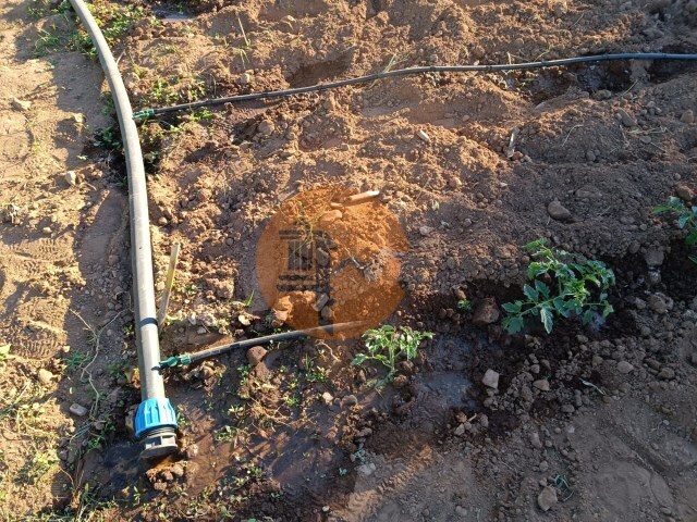 Água de rega e sistema de rega no terreno.