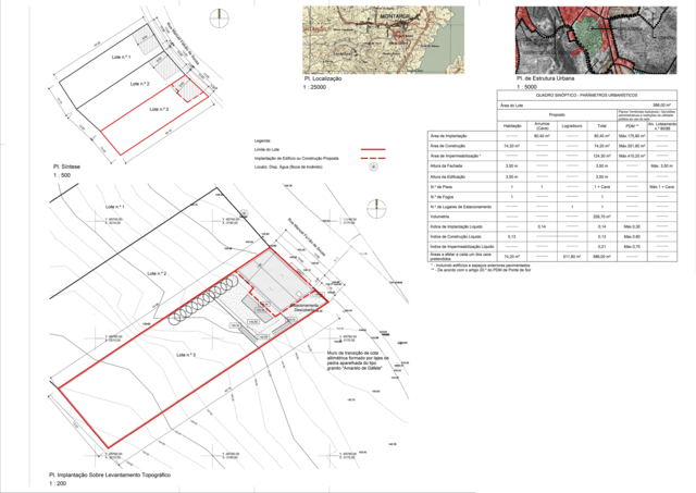 O projeto aprovado consistem em moradia de rés de chão e cave, composta por dois quartos, cozinha e sala em open space, casa de banho, terraço e espaço lateral para estacionamento. Na cave amplo espaço com 38 m2, casa de banho e duas divisões.
